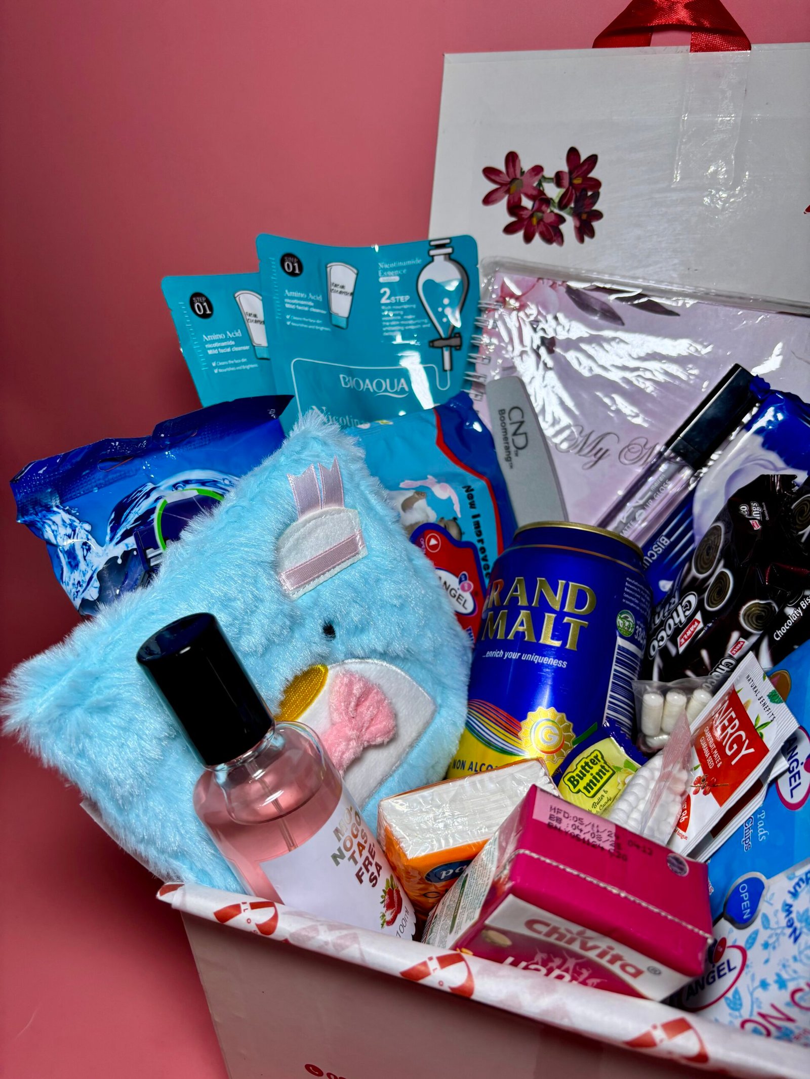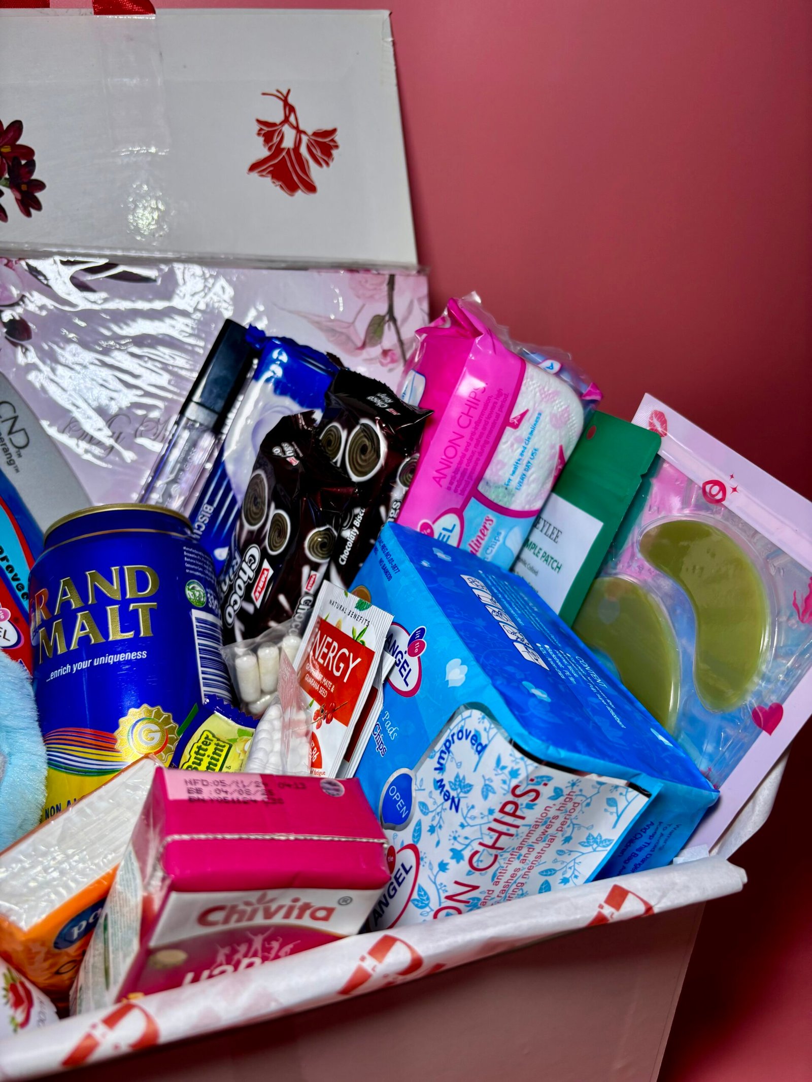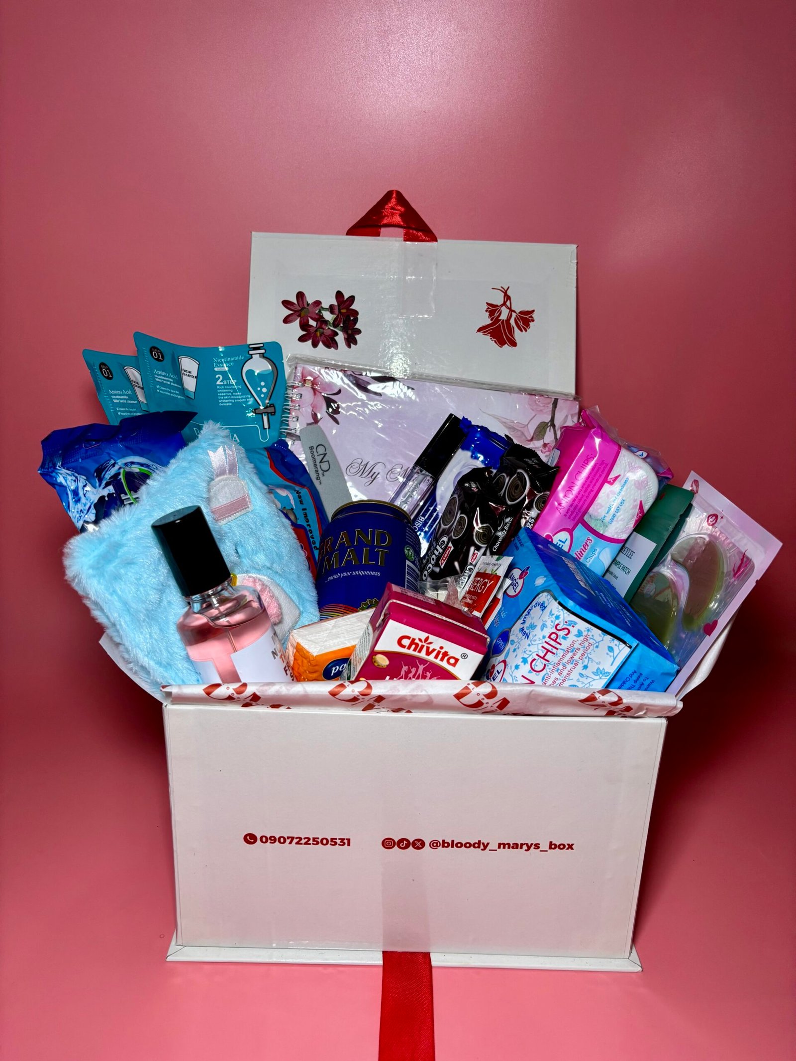 This box contains a pack of Pad, Panty liner, Booty wipes, Calming Tea, Boric Acid pills, Shaving stick, Drink, Snacks, Note pad, Pen, Pocket tissue, Lip Gloss, Face sheet mask, Eye mask, Cotton bud, Lip mask, Period pouch, Body mist, Nail buffer/Cramp Relief Heat Patch, Pimple patch